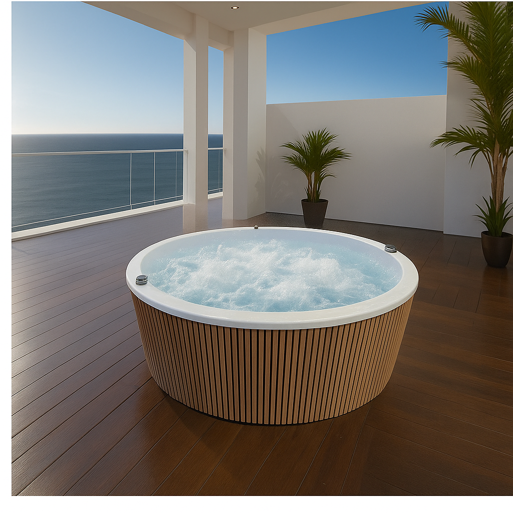 The Saldanah Jacuzzi is a premium, locally crafted spa ideal for both large gatherings and intimate moments. Its round shape and unique design fit seamlessly into any space.